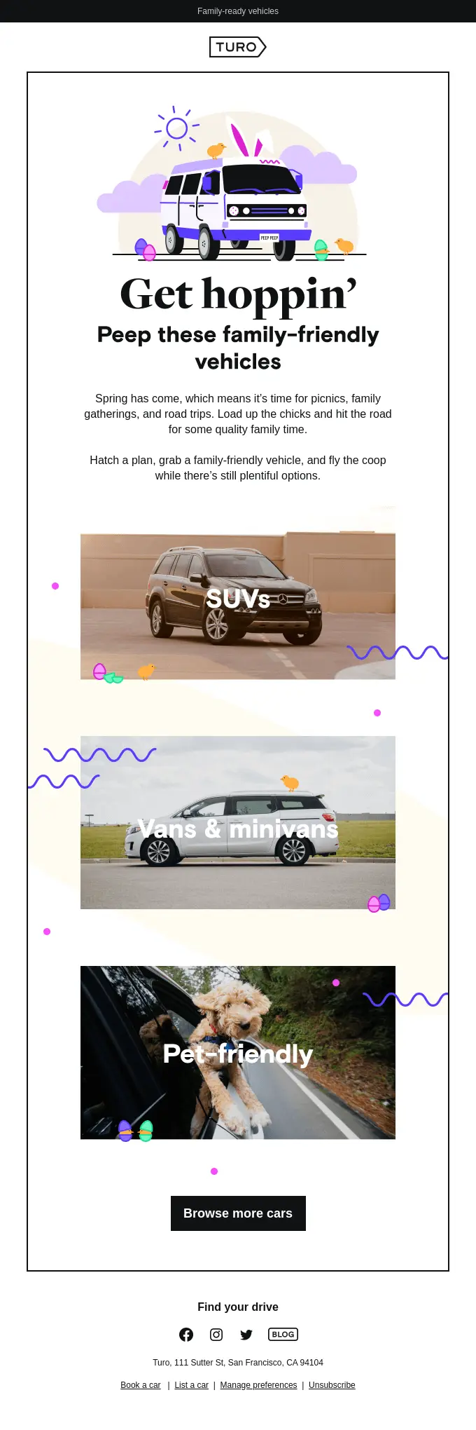 Have you ever stopped to think about the logic of a rabbit delivering eggs? Never mind, it’s so entrenched in Easter imagery that we’re stuck with it. At least you can use it as a metaphor for holiday travel, like holiday vehicle rental brand Turo has here.