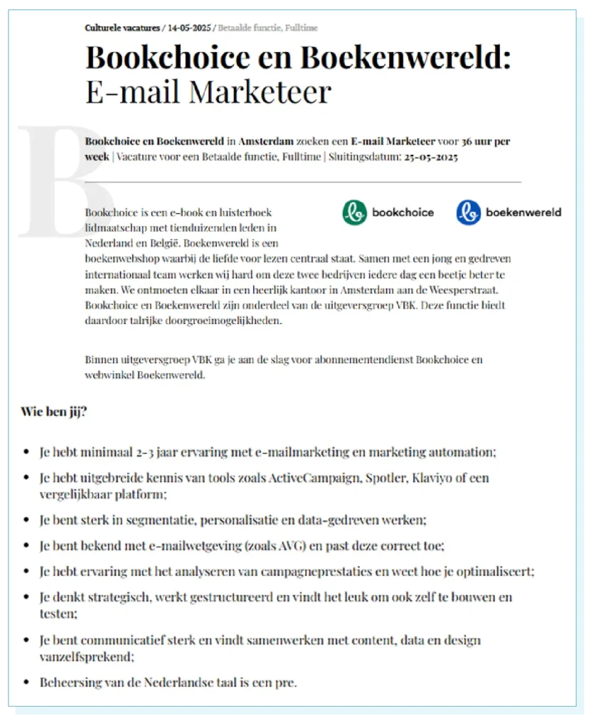 Spotler wordt best veel ingezet door organisaties die werken in de kunst- en cultuursector, maar de specifieke vacaturesite van deze sector kennen we niet. In een vacature voor E-mail Marketeer binnen de uitgeversgroep VBK worden wij genoemd: