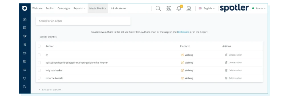 Natuurlijk kun je in je software voor media monitoring voor jou belangrijke zoekopdrachten inrichten en opslaan. Maak bijvoorbeeld auteursoverzichten en laat je media monitor het werk doen. Vaak kun je hierop ook weer filters instellen, zoals: type content, bron, sentiment en taal. In de media monitoring software van Spotler ziet zo’n auteursoverzicht er als volgt uit: