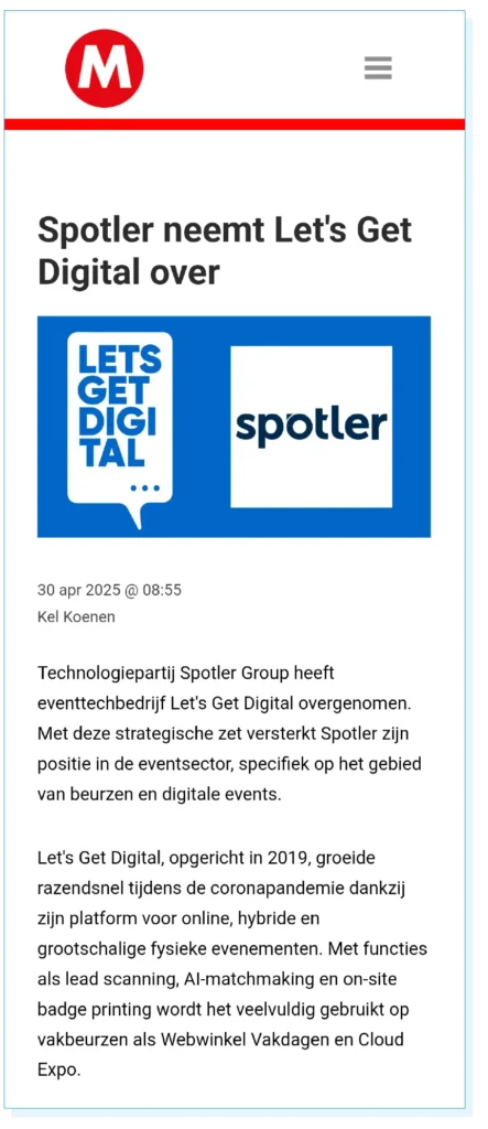 Nagenoeg iedere B2B- en B2C-organisatie verspreidt nieuws. Soms als nieuwsbericht, soms als blog en misschien zelfs in de vorm van een persbericht. Maar het kan natuurlijk ook een bericht op social media zijn. Om een voorbeeld te geven: Spotler is onderdeel van de Spotler Group en op 30 april 2025 kondigden wij aan dat we het bedrijf Let’s Get Digital hebben overgenomen. We schreven er onder andere over op ons eigen site en op LinkedIn: