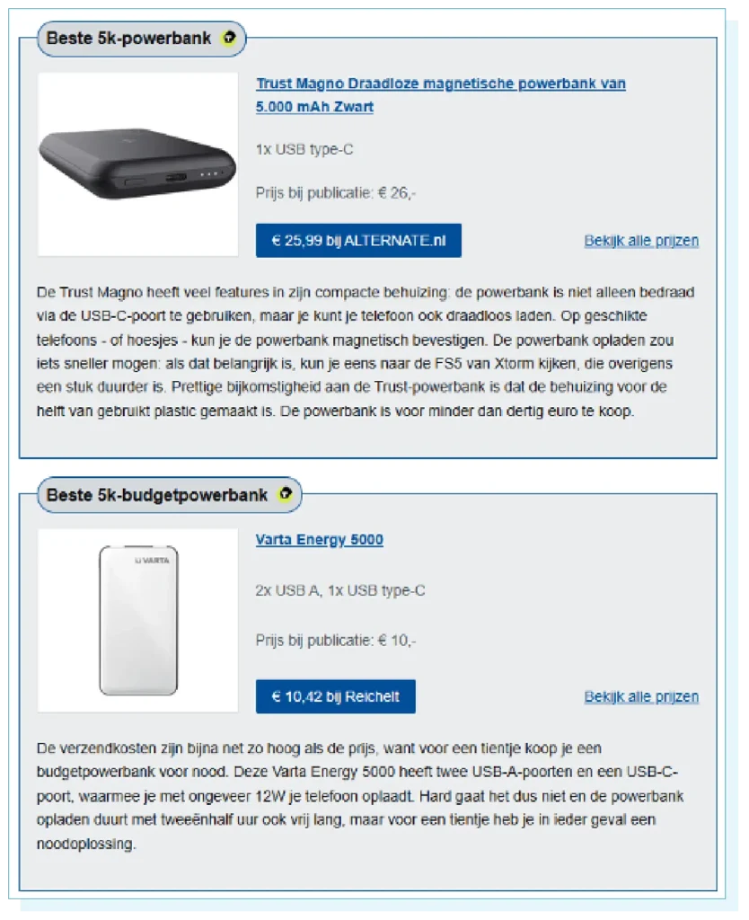 Stel: je werkt bij ALTERNATE.nl en je verkoopt onder andere powerbanks. Op Tweakers wordt jouw webshop genoemd als de beste koop voor de 5k-powerbank van Trust. Je verslaat zelfs grote concurrenten als Amazon en Bol. Wat te denken van een leuke post op je socials om deze geweldige vermelding op Tweakers onder de aandacht te brengen? Uiteraard: het is wel jammer dat je de beste 5K-budgetpowerbank niet in je assortiment hebt. Daar wordt jouw concurrent Reichelt genoemd. Misschien moet je hen iets meer in de gaten houden?