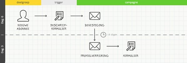 Hieronder zie je alle stappen achter elkaar van een welkomstcampagne. In deze campagne wordt ook extra persoonlijke informatie gevraagd aan de nieuwe abonnee. De profielverrijking start op dag 3.