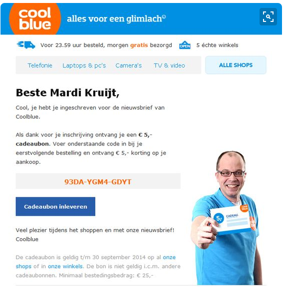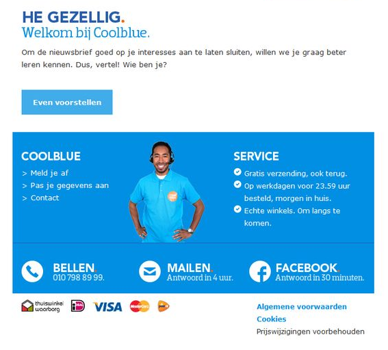 Het voorbeeld van Coolblue is een simpel en leuk. Haal hier inspiratie uit. Zo leer je de klant beter kennen en kun je toekomstige nieuwsbrieven en e-mail campagnes op hem of haar afstemmen.