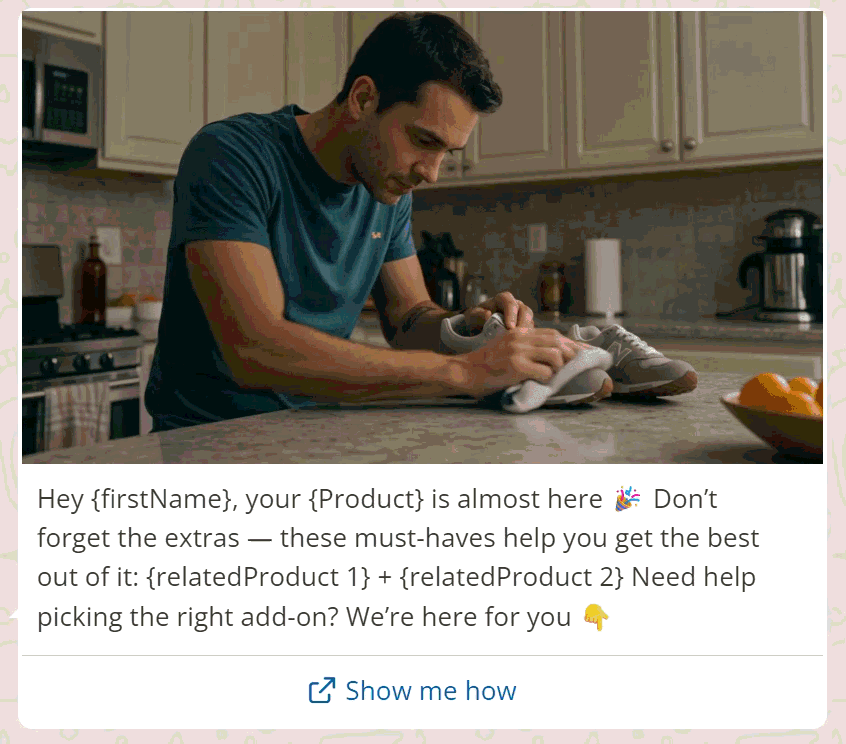 Another great way to use WhatsApp as a post-purchase channel is when you match the timing with the product type. For accessories or bundles? Send the message 30 minutes to 2 hours after checkout. For replenishable items? Send a reminder when you estimate they’re running low. For complex items? Wait a day or two, then suggest supporting products (e.g. care kits, add-ons, how-to content).