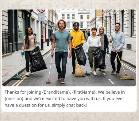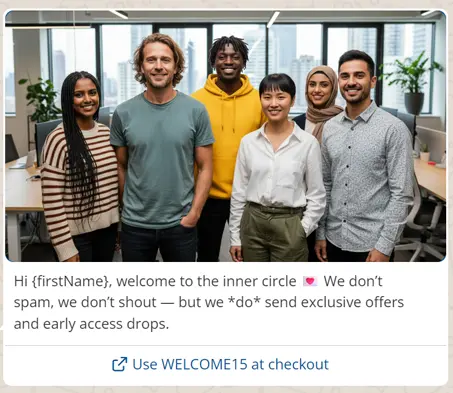 Too many welcome messages jump straight to the discount. But before you sell, you have a rare chance to stand out, set your tone, and give people a reason to remember (and like) you. WhatsApp is a personal space. So make your welcome feel more like a message from a friend than a formal brand newsletter. Add warmth, add value, and, if it fits, add a little humour or humanity.