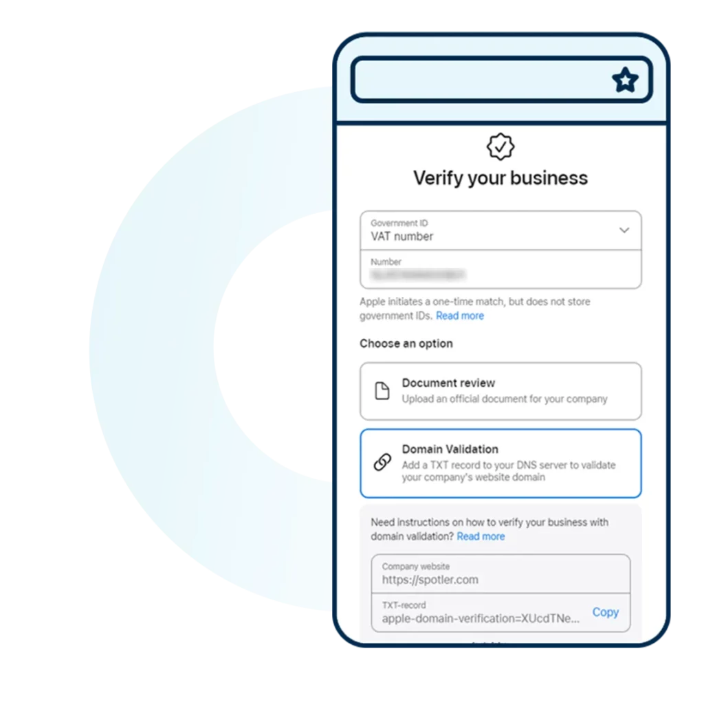 To verify your company’s existence, Apple then asks you to enter your company ID (such as KvK, SIREN, or VAT number) and add a TXT record to your DNS to validate the domain. Alternatively, you can upload a legal document for identity verification, though domain verification is often quicker.