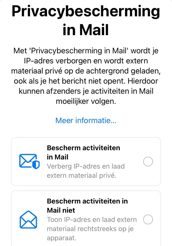 Iedere gebruiker die na de iOS 15 update voor het eerst de Apple Mail app opent, krijgt een boodschap te zien met daarin de keuzeoptie ‘Protect Mail activity’ of ‘Don’t protect Mail activity’. Apple-gebruikers kunnen hierdoor kiezen of ze wel of niet willen dat hun IP-adres wordt getoond aan de verzender. Ook geeft de gekozen optie aan of de content van de verzender direct binnengehaald en gedownload wordt of dat Apple als tussenpartij fungeert tussen verzender en ontvanger. Wij achten de kans zeer groot dat 9 van de 10 gebruikers denkt: “Protection klinkt goed, laten we dat instellen.” Dat voelt immers als de veilige, verstandige keuze.