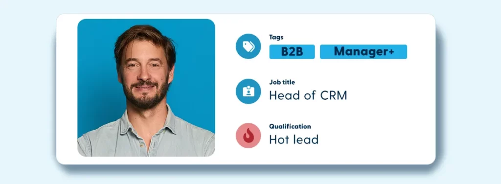 For example, we use a tag ‘ Manager+ ’ where we include all job titles with ‘Head of…’ and ‘…Manager’ or ‘CxO’. We place this tag as soon as data comes in, for example via a form in which one of these job titles appears. We also use tags as filters on incoming data. We give the behaviour a score.