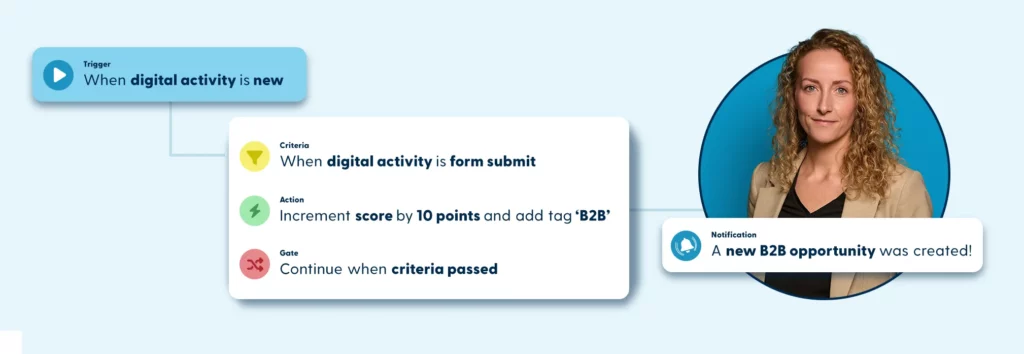 As soon as a lead fills out an online form, this digital activity is given a score of 10 points. In addition, this activity is added to the B2B tag. If the criteria for leads are met, Sales receives a notification. In this way, Marketing labels the filling out of a form with a tag and a score.