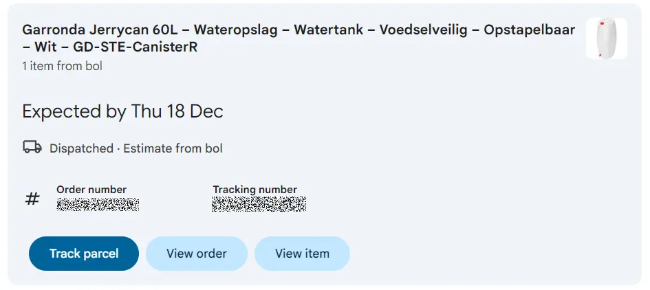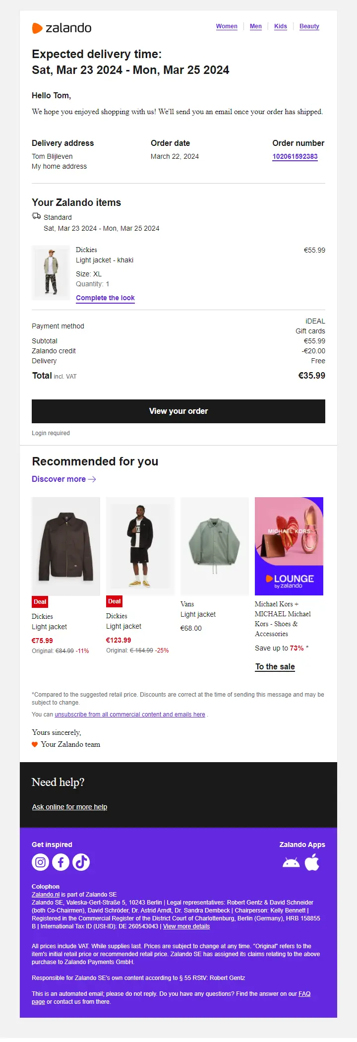 The Zalando example below starts with the estimated delivery date, good, and has the delivery address link to Google Maps, perfect, so you know exactly where the delivery will take place. Particularly handy with drop-off points, of course: