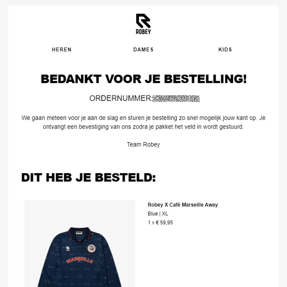 An order confirmation email should always start with a clear summary of what just happened. Often, the subject line already does most of the work, for example: “Thank you for your order #1234”.