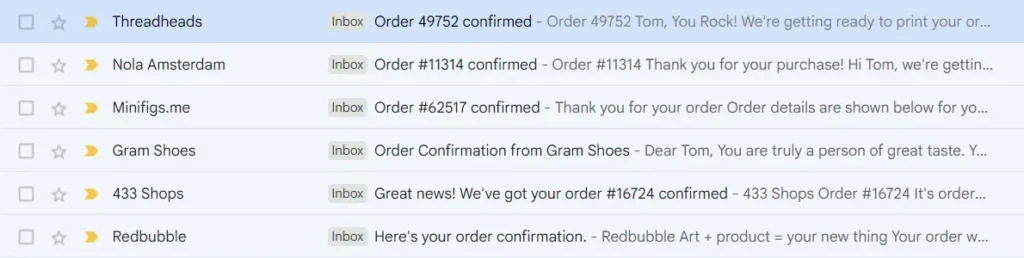 Over the past few years, inboxes have evolved beyond being just a list of unread messages. Apple (Mail), Google (Gmail), and Microsoft (Outlook) are all in their own way trying to retain customers by serving them the best content first. In Gmail, for example, this means that order confirmations can be summarised like this example. Note this is not part of the email itself: