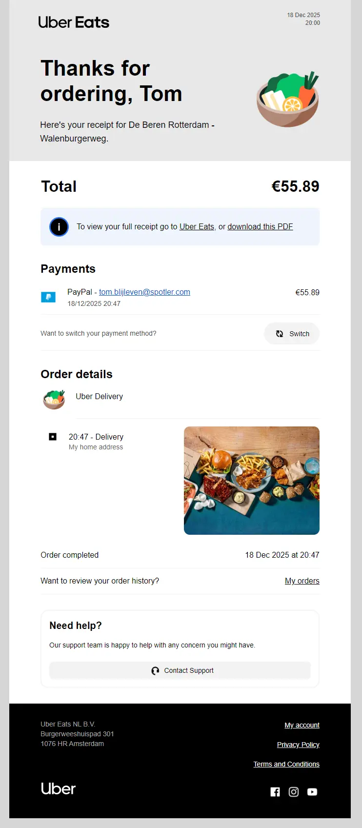One example I found particularly exciting is Uber Eats’ order confirmation process. Since I ordered using PayPal, it also allows me to change my payment method. I assume that paying with a debit card would not show this button: