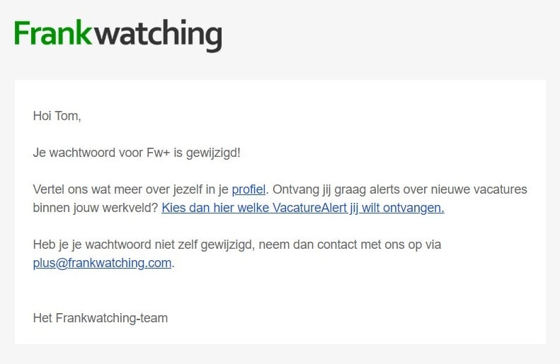 Deze e-mail heeft de simpele boodschap dat het wachtwoord gereset is en dat de gebruiker er nu mee kan inloggen. Vaak wordt eronder nog vermeld: “Was jij dit niet? Neem dan contact met ons op”.