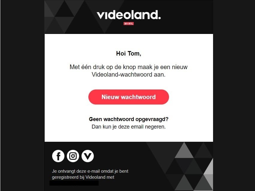 Naast dat je verzender-details moet laten zien, kun je ook in de styling van je e-mail het vertrouwen van je ontvanger winnen. Stuur daarom, in plaats van een kale e-mail met een resetlink, een e-mail in jouw stijl en met jouw logo. Zo laat je niet alleen met woorden weten dat het een legitieme e-mail is, maar ook met je design, zoals dit voorbeeld van Videoland: