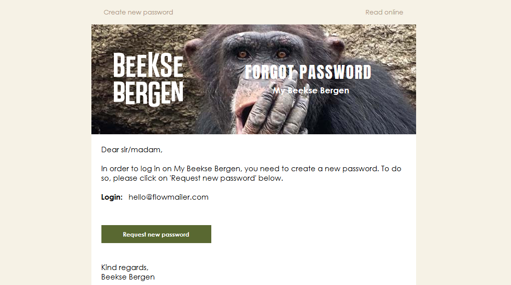 Je ontvanger zit er niet op te wachten om een stuk te moeten scrollen voordat hij bij de wachtwoord reset knop aankomt. Maak daarom je content zo kort en bondig mogelijk. Maak in een paar zinnen duidelijk waar de e-mail om draait. Je design mag natuurlijk aansluiten op de situatie, zoals in het voorbeeld van Beekse Bergen hieronder. Toch blijft de boodschap helder en hoeft de ontvanger niet te scrollen. Er is meteen duidelijk om welk merk het gaat, wat het loginadres is en wat het doel is van deze e-mail. Dat is alles wat er in een wachtwoord reset e-mail hoeft te staan.