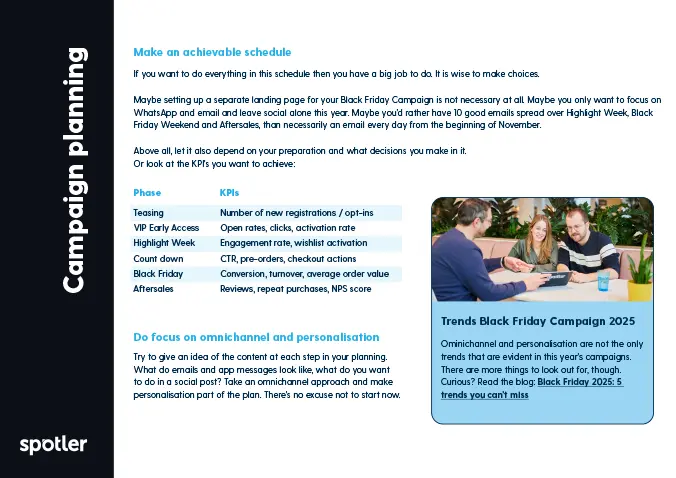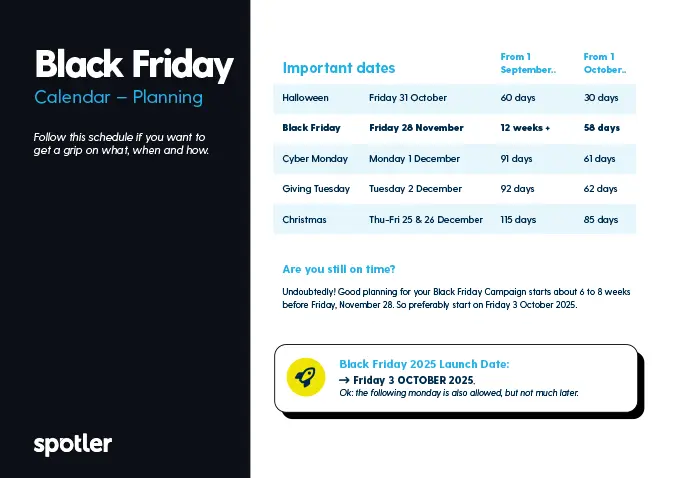 Good planning is essential for the success of your Black Friday campaign. Stay on top of your schedule with our handy calendar, which includes all the important dates.