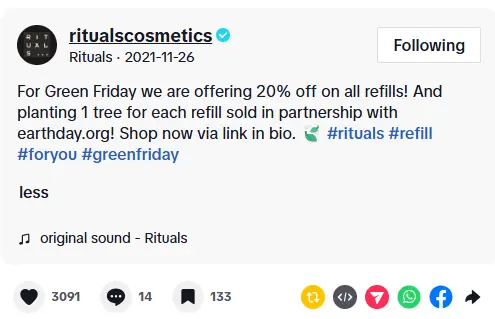 A good example of how brands can lean into this trend is Rituals, who hit an eco-friendly double by both promoting refills and planting a tree for each sale.