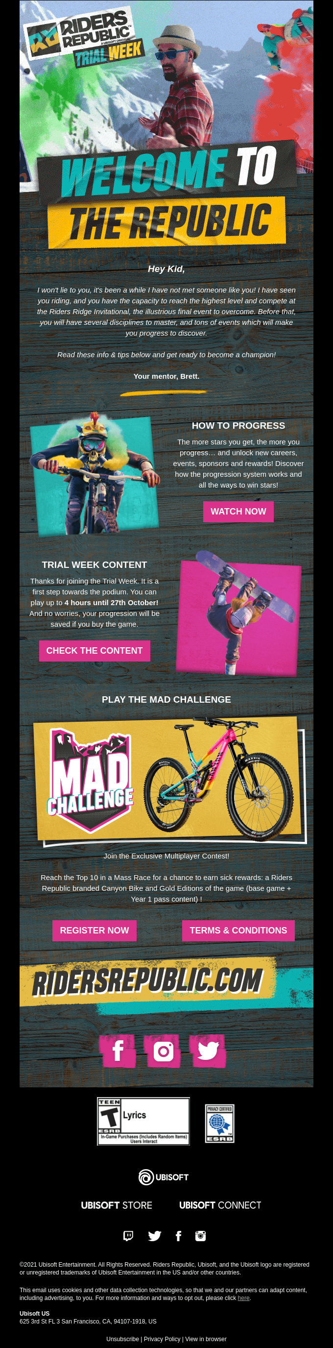 This welcome email from Ubisoft’s Riders Republic really hits the spot. It’s adventurous, playful, and it tells a story. It’s really incorporated in the gameplay of Riders Republic – which, honestly, isn’t something we’ve ever seen: