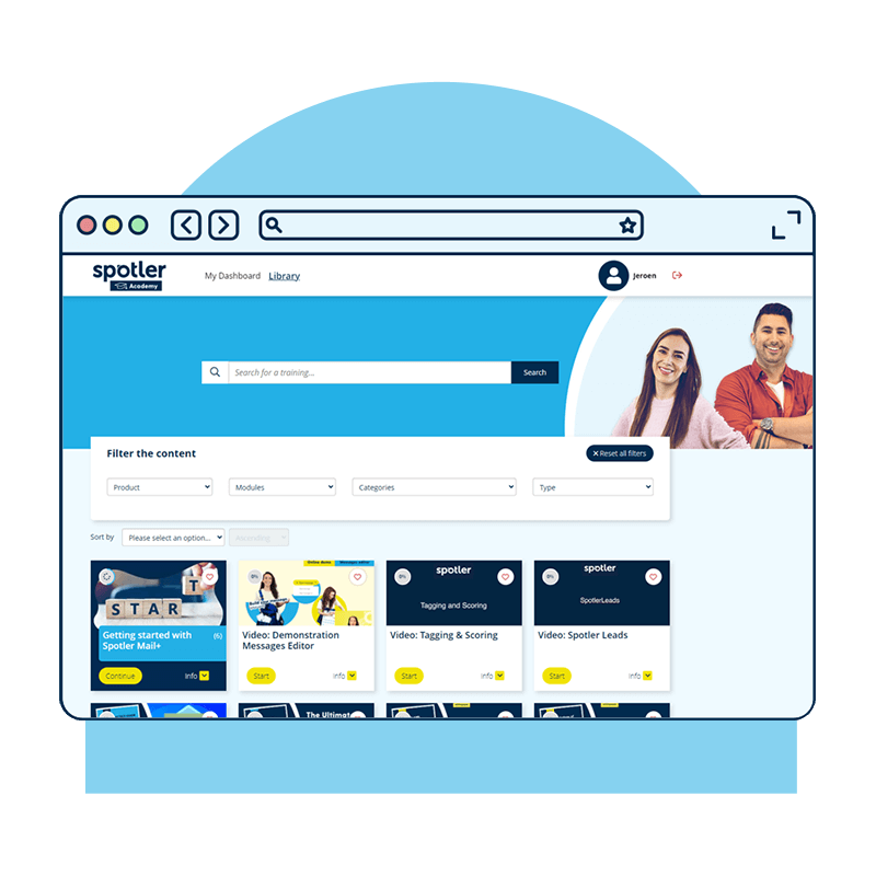 At Spotler, we like to learn from each other. The Spotler Academy and our help centres, created especially for our customers, is immediately available to you when you come to work with us. We are going to teach you everything about marketing. And a wide range of experts work at Spotler. From CSS experts, HTML specialists, template builders, UX designers, customer journey specialists, content marketers, and podcast enthusiasts. And we can even teach you how to give a webinar. We have many colleagues who enjoy sharing knowledge. After all, we are #OneTeam