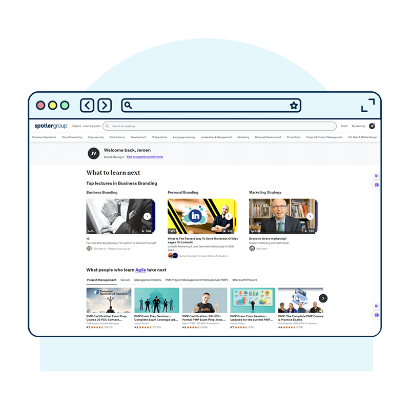 At Spotler, we work with the online training platform Udemy, where you can take thousands of courses and receive training. You can go there for work-related courses, such as JavaScript, Power BI, or Scrum. We even have our own Spotler Learning Path with in-depth recorded product demos so you can learn all the ins and outs of the software we develop. But you can also take training courses on mindfulness, Presentation, or, for example, guitar lessons. At Udemy, you can develop all these skills at your own pace and completely online.