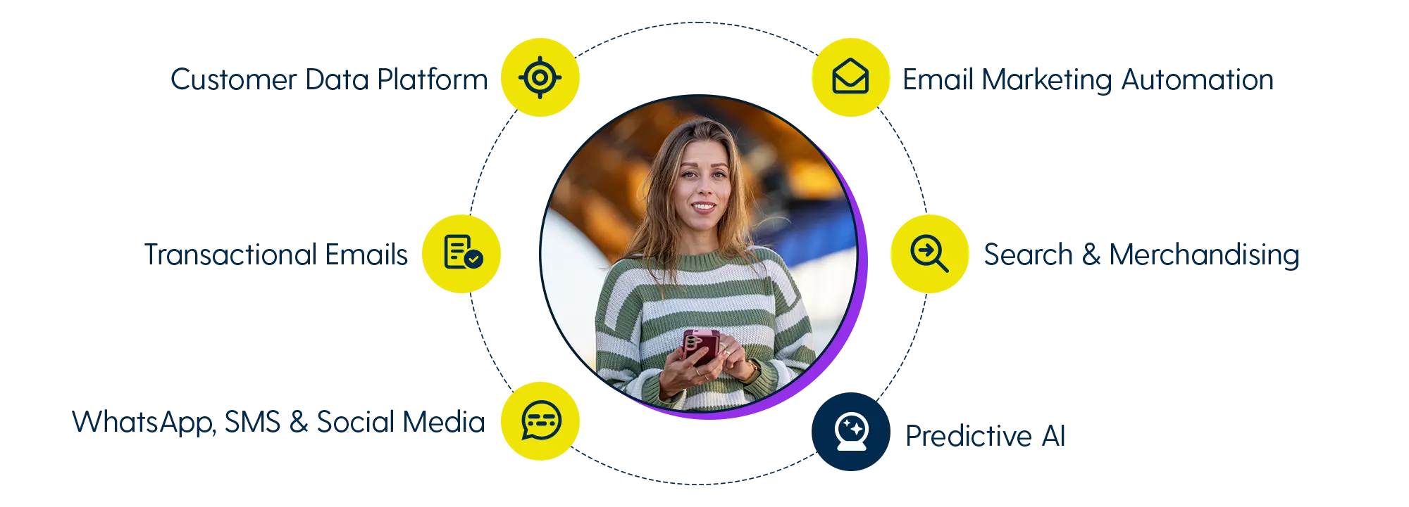 Our Marketing Cloud for Commerce is built to connect data, channels and insights, so that you can easily build profiles and journeys from first visit to returning customer. It gives you all the tools to run smarter AI-driven campaigns across all channels and to do onsite personalisation and recommendations for better experiences. Modular by design, so you get what you need, and nothing what you don’t want.