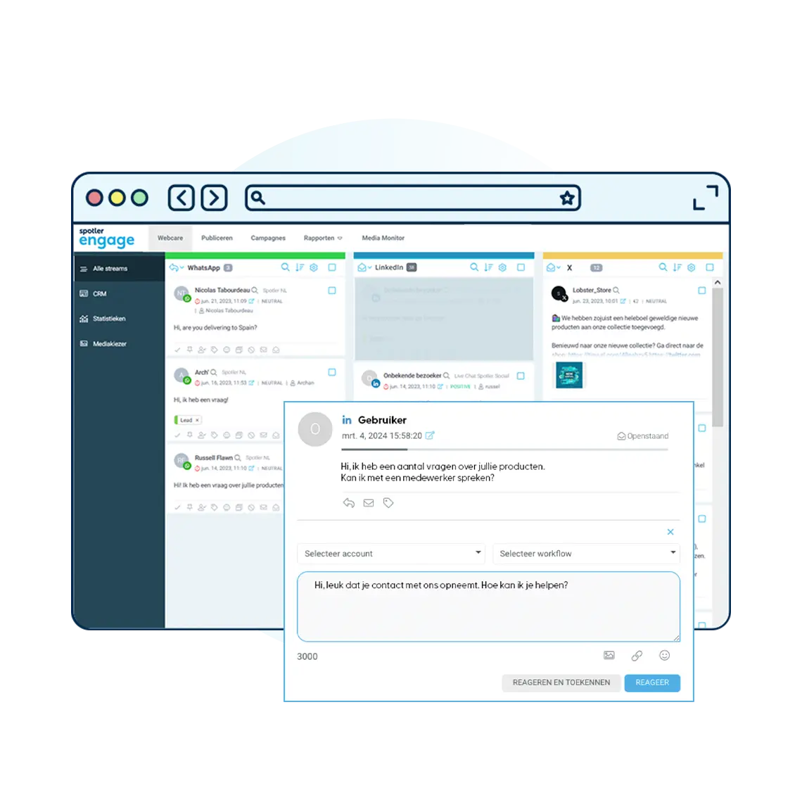 Never miss a question from (potential)customers or a mention of your brand. Monitor social media and other sources, allowing you and your team to respond directly to questions and posts from a single, clear community management dashboard.