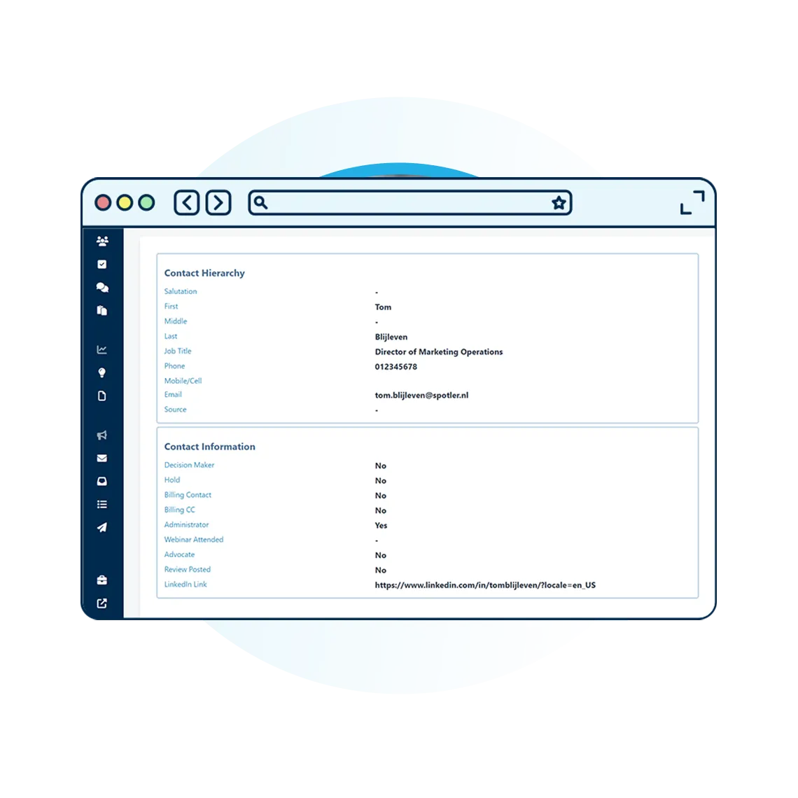 Optimiza tus procesos de marketing y ventas desde el primer contacto hasta el cierre de la venta. Crea oportunidades, desarrolla campañas de lead nurturing y automatiza tareas. Centraliza los datos de interacción web y por correo electrónico de tus contactos en un único lugar. Con Spotler CRM, podrás compartir información en tiempo real entre todos los equipos de la empresa, garantizando no solo una experiencia consistente para los clientes, sino también mejorando la efectividad de tus estrategias de ventas y marketing.