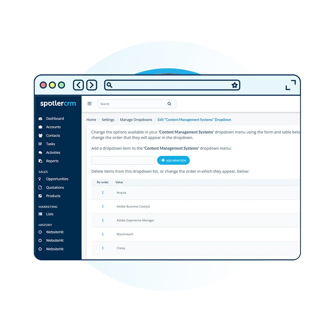 Spotler CRM se puede personalizar según tus preferencias. Puedes agregar nuevos campos y gestionar el acceso de usuarios de diversas maneras. Pero eso no es todo: también puedes personalizar el diseño, los gráficos y los paneles de control. Así que en Spotler CRM puedes configurar y manejar tu proceso de ventas y tus tablas de datos exactamente como te gusta.