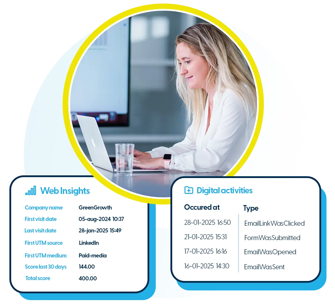 Digital activities offer you an overview of email open and clicks, page views, form fills and more. This information can be used for creating reports, setting up lead scoring automations, or triggering nurturing campaigns.