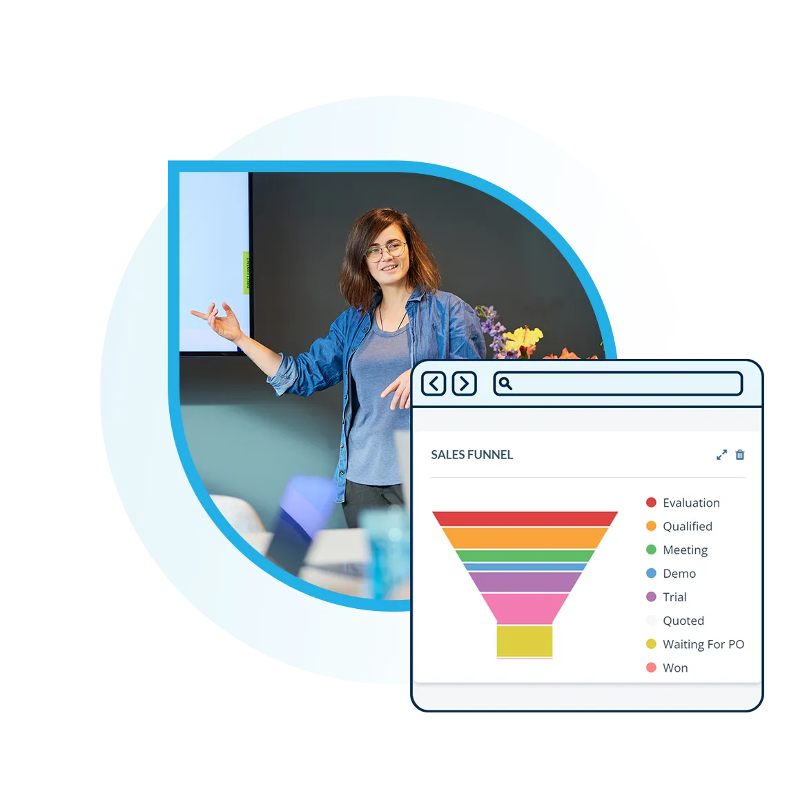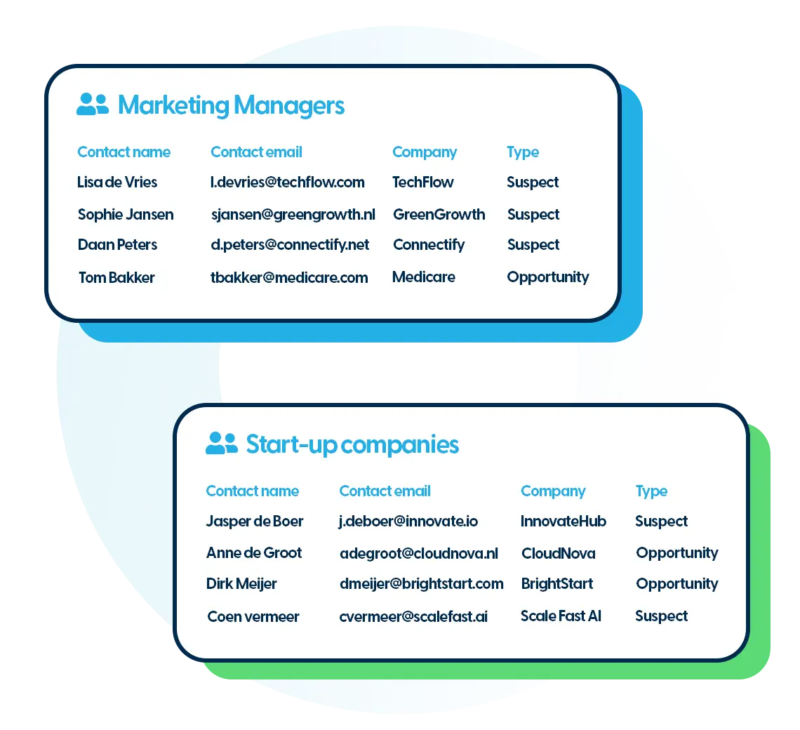 Account and contact data: View leads, prospects, customers, linked accounts, and associated contacts. Customise what data is shown, e.g. type, source, last update, or account owner.