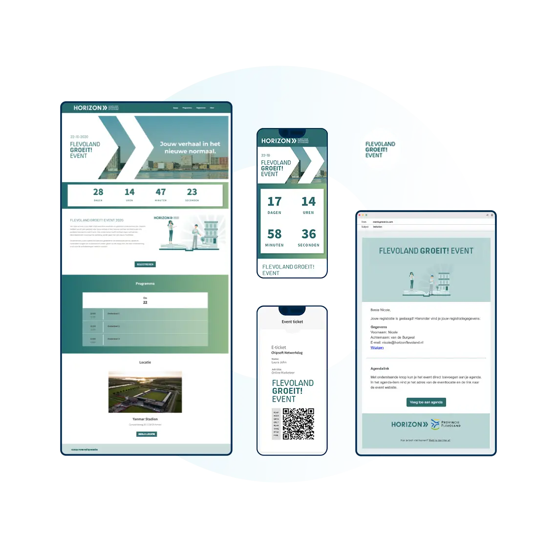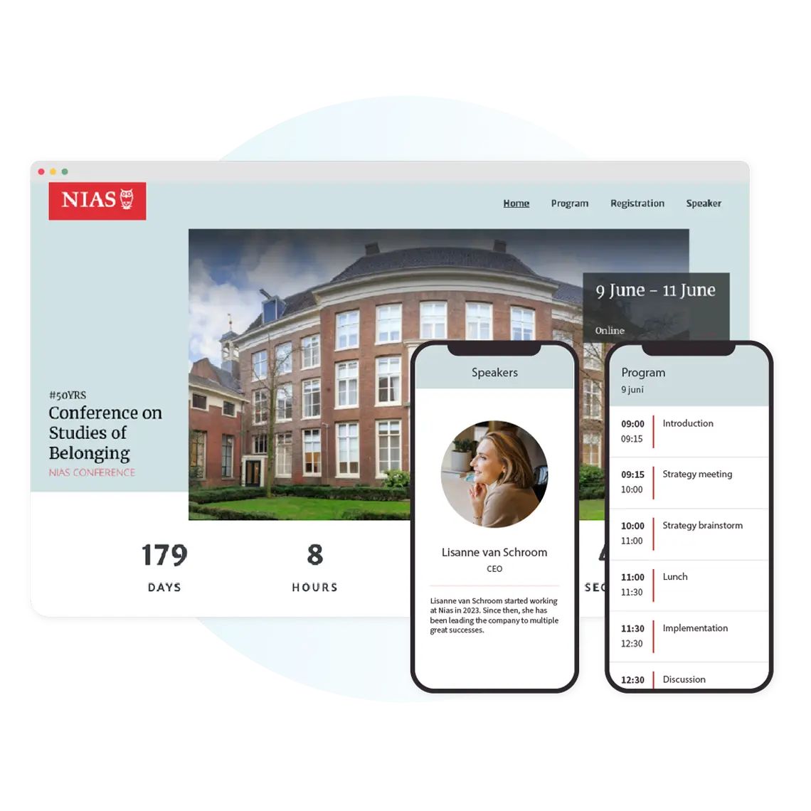 Keep events on brand with mailings and websites that reflect your company’s style, without needing technical expertise. Save time using account templates, and customise your sender address and domain to remain recognisable. Track your success with detailed mail and website statistics. You can also include key event details like location, agenda, and speakers, and even create a mobile app experience for your participants.