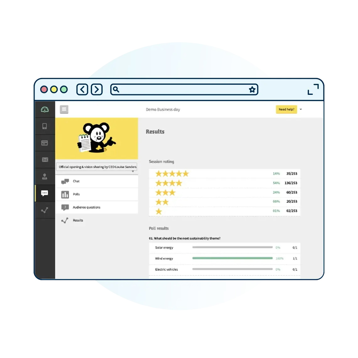 Organising your events online? Manage separate invitee lists for online and in-person attendees, and tailor distinct communications, including invitations, reminders, and updates. Enhance the experience with embedded live streams, personal program pages, and an online lounge. Keep participants connected with live chat, interactive polls (including word clouds), and viewer questions. At the end, collect instant session feedback with online surveys to continually improve your events.