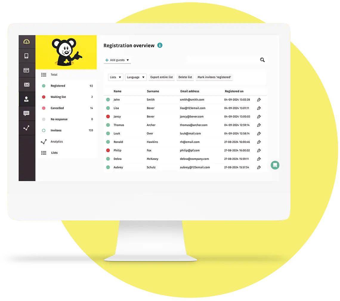 Send branded invitations, reminders and follow-ups that match your event’s look and feel. Use ready-made templates and automated confirmation and thank-you emails to keep your communication clear and professional from start to finish.