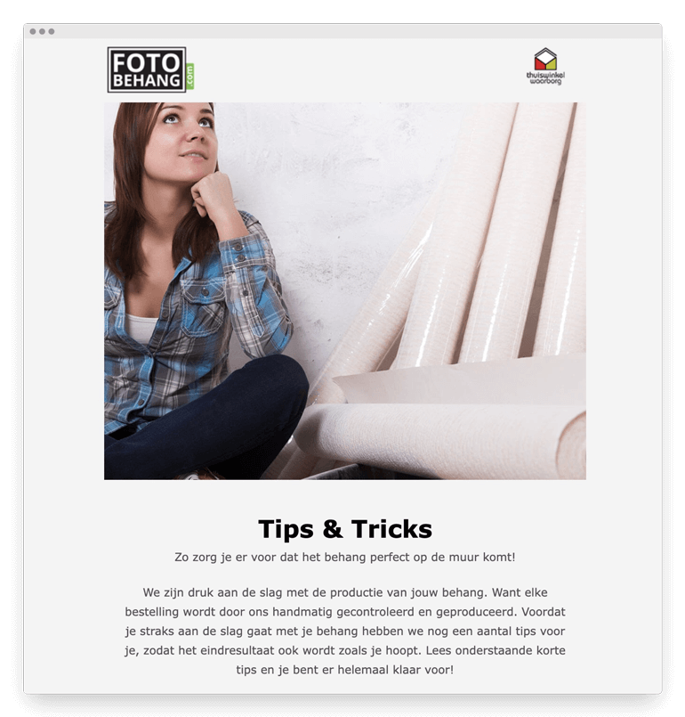 Wanneer een bezoeker klant is geworden, omdat deze een order heeft geplaatst, krijgt de klant na 24 uur een e-mail met tips om met de voorbereidende werkzaamheden te kunnen starten. Hierin wordt ook aangegeven dat de productie van het gekozen fotobehang in gang is gezet.