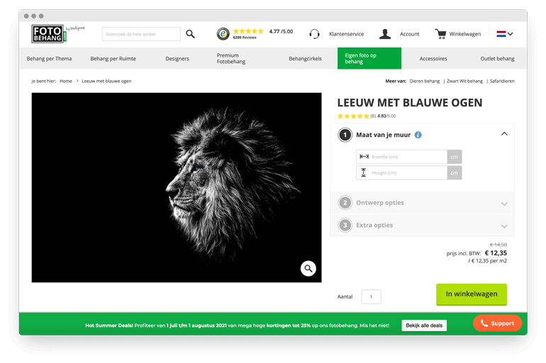 Met Spotler Activate kan je checken waar in het beslissingsproces de klant zich bevindt. Op basis daarvan toont Fotobehang.com een notificatiebalk met een kortingscode als de klant over moet gaan naar bestelling. Hierdoor is een conversiestijging van maar liefst 39% behaald.