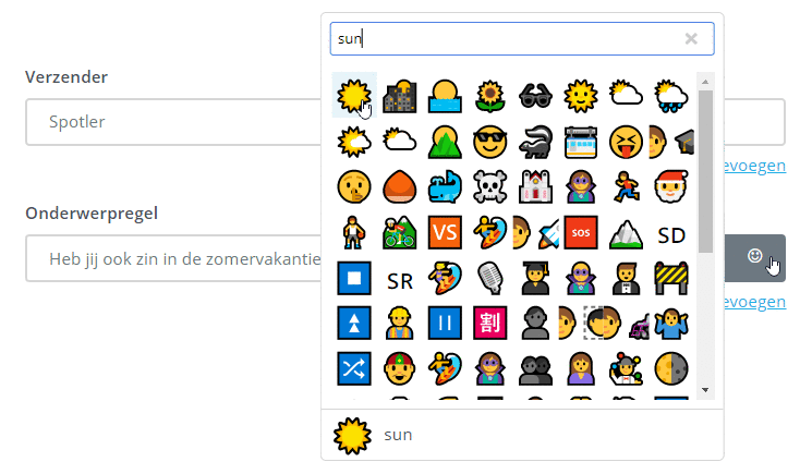 Met onze e-mail marketingsoftware is het helemaal een fluitje van een cent. Er is namelijk een emoji-toets beschikbaar in Spotler Mail+, waarmee je direct kunt kiezen uit verschillende emoji’s om in je onderwerpregel te plaatsen.