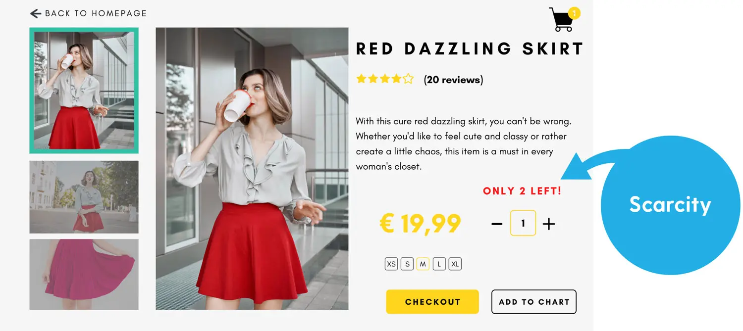 Showing real-time stock as soon as a few products are left, consumers are faced with the fact that these products are not on sale forever, and they might miss their chance to get them. This creates a sense of urgency. Businesses in the travel and leisure industries use this principle a lot. For example to show how many rooms are left available in a hotel on the dates you want. But also, the fashion industry makes use of this principle by showing how much stock is available of a specific item on your size. See the example below: