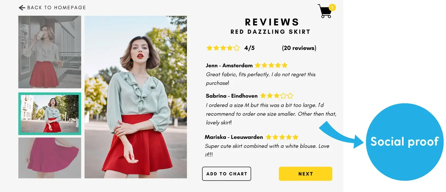 A way to use social proof in your online business is, for example, by collecting online (product) reviews. Consumers tend to value the reviews and opinions of others more than the information shared by a salesperson. A positive review or good product rating is nowadays an important factor in considering whether to buy or not. Also, the approval from relevant experts is an example of social proof. Below we show you an example of social proof.