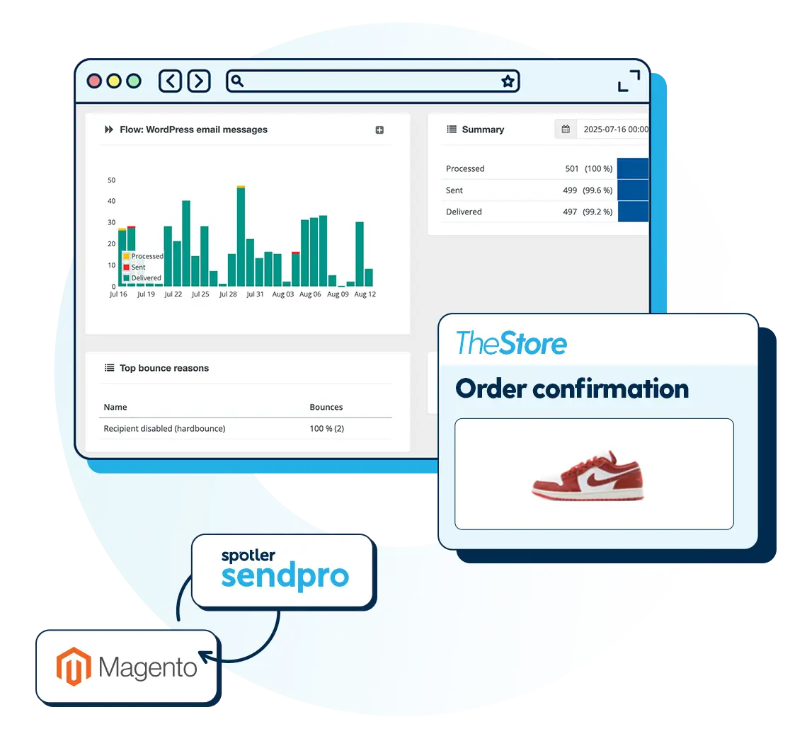 Spotler SendPro integrates with Magento to send essential service messages, including order confirmations and shipping updates. These emails match your brand, arrive without delay and can be tracked from within Spotler.
