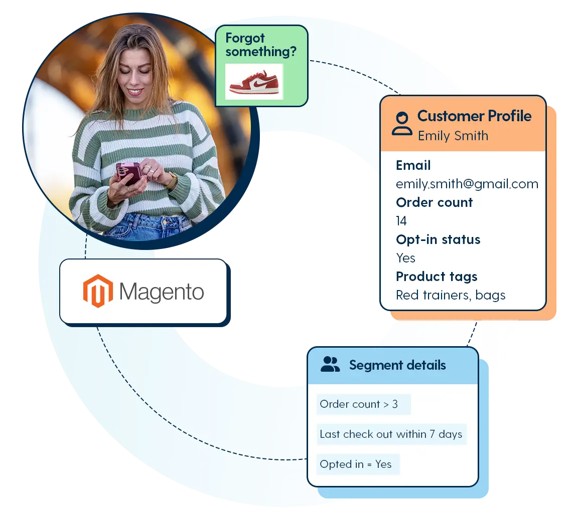 The Magento connector syncs profiles, orders, opt-in status and checkout behaviour directly into your Spotler tools. With this live data, you can identify segments, personalise campaigns and follow your customers from their first visit through to repeat purchase.