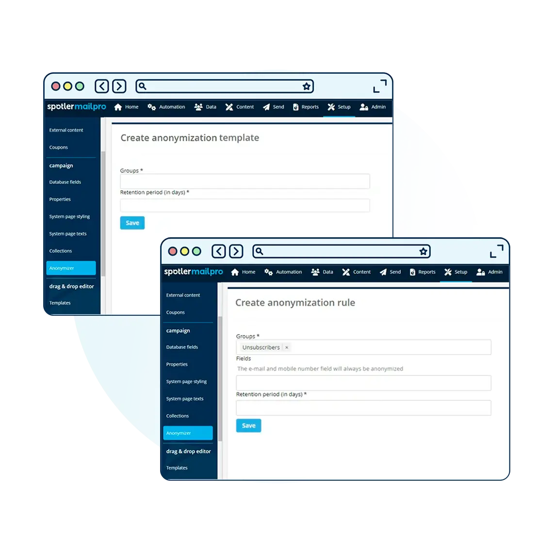We prioritise security with ISO 27001 and 9001 certifications. For strong privacy rules you can anonymise fields such as contact details or statistic after a campaign or when contacts haven't engaged.