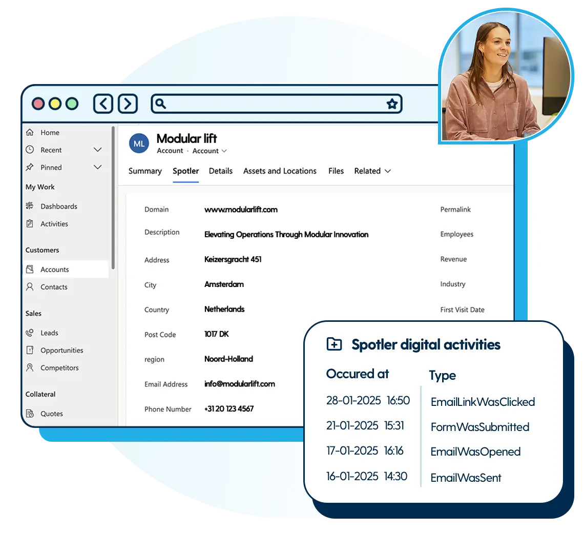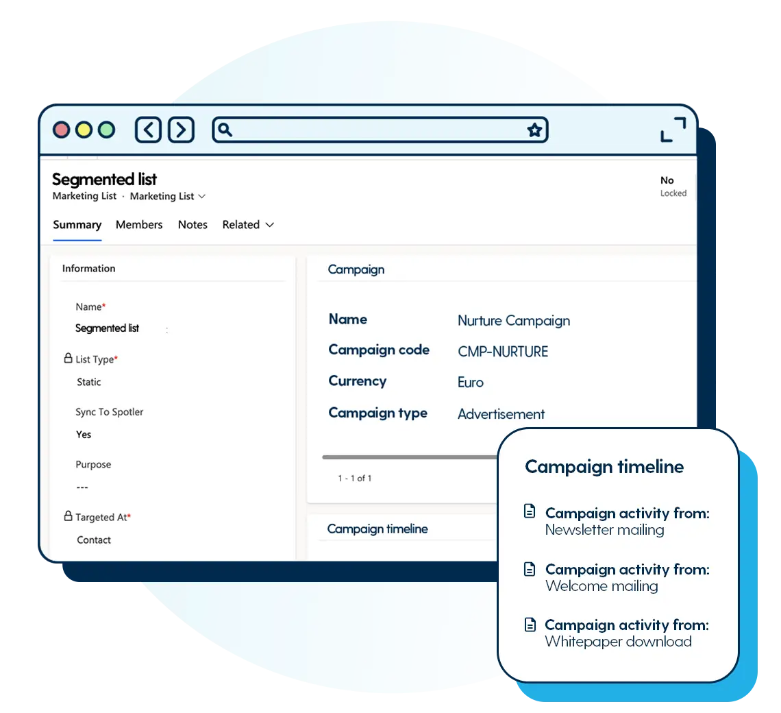 With the Microsoft Dynamics 365 connector, Spotler helps you bring marketing and sales closer together. All the rich account and contact information flows into Spotler, so you can build highly targeted campaigns. Every response and interaction then syncs straight back, keeping both marketing and sales teams aligned.