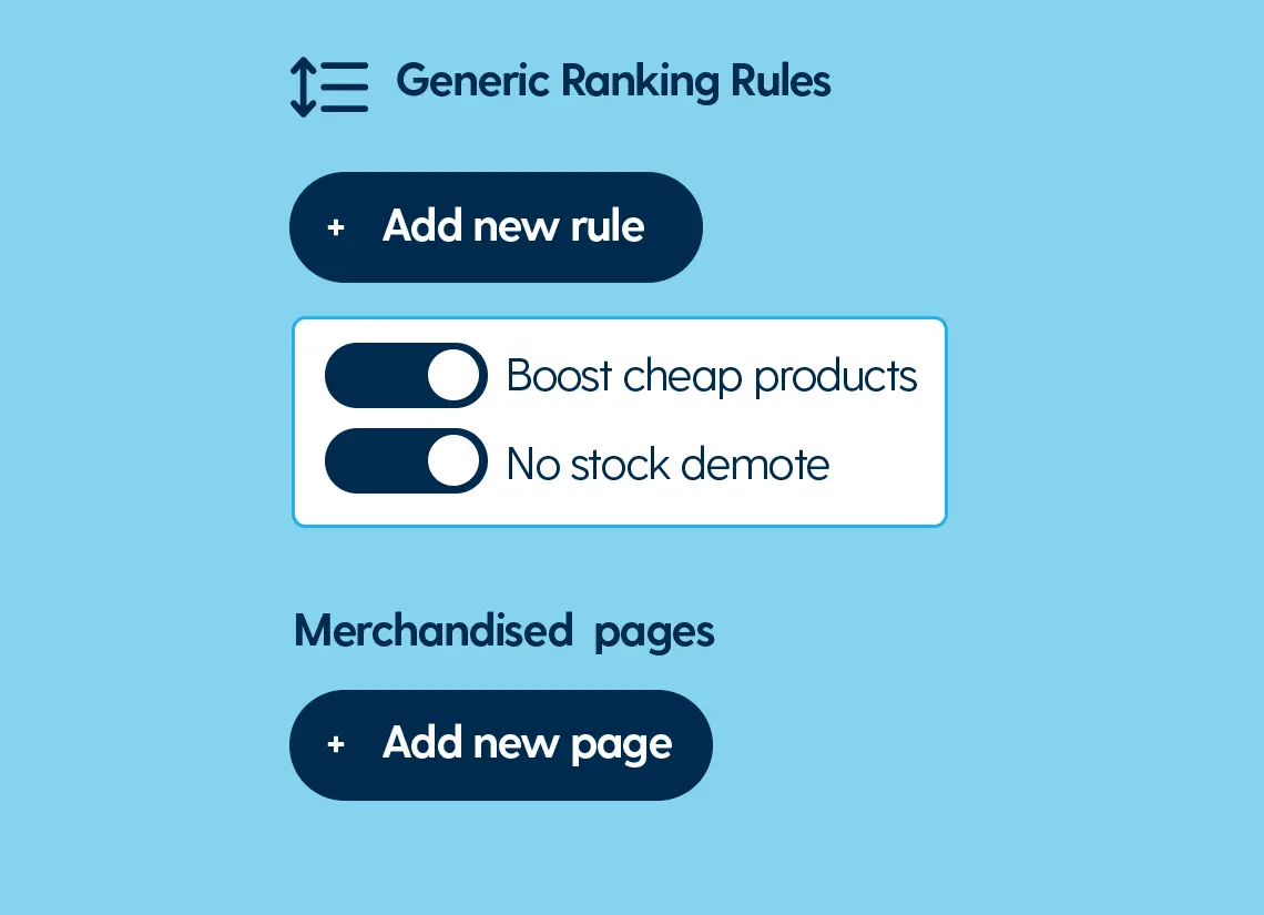 Combine powerful personalised search with built-in merchandising tools to connect shoppers to what they’re looking for and highlight the products you want them to see. It’s all about removing friction, boosting conversions, and taking control of the journey to purchase.