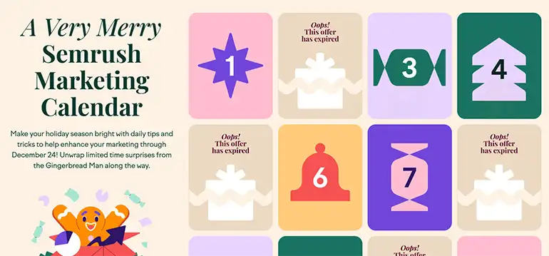 - Concept: Semrush launched an interactive Holiday Marketing Calendar offering daily SEO and content tips, downloadable templates, and light-hearted festive assets for marketers.