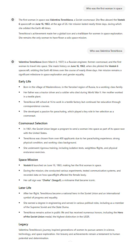 ChatGPT, en cambio, trata estas dos preguntas como si fueran diferentes. Por eso, recuerda: si quieres que ChatGPT te dé respuestas útiles, asegúrate de ser lo más específico posible o utiliza preguntas de seguimiento para guiar la conversación.
