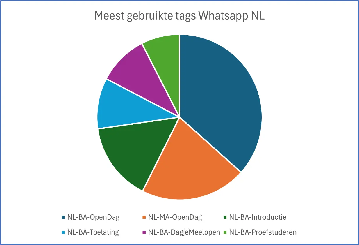 Omdat de Radboud Universiteit aan berichten ook tags hangt, krijgt de universiteit inzicht in het soort vragen dat het meest gesteld wordt. Dat kan eventueel gebruikt worden als input om de informatievoorziening op de website aan te passen. Denk aan: de Open Dag (tijdelijk) prominent op de homepage zetten. Bij WhatsApp NL zijn het vooral vragen over Open Dagen; bij WhatsApp Internationaal zijn het vooral vragen over beurzen en toelatingseisen.