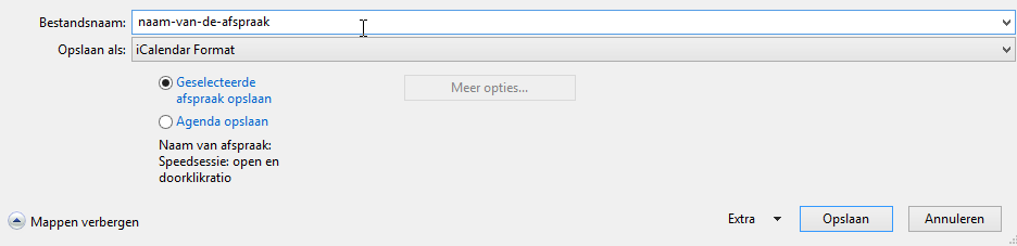 Maak de afspraak aan zoals je dit gewend bent in bijvoorbeeld je Outlook agenda. Op dit punt kun je alle informatie toevoegen die relevant is voor de aanwezigen. Denk dan aan de eerder genoemde routebeschrijving of een document. Sla de afspraak op via ‘Bestand’ en kies voor de optie ‘Opslaan als’. Hier zie je dat het bestand opgeslagen wordt als .ICS bestand op je computer.