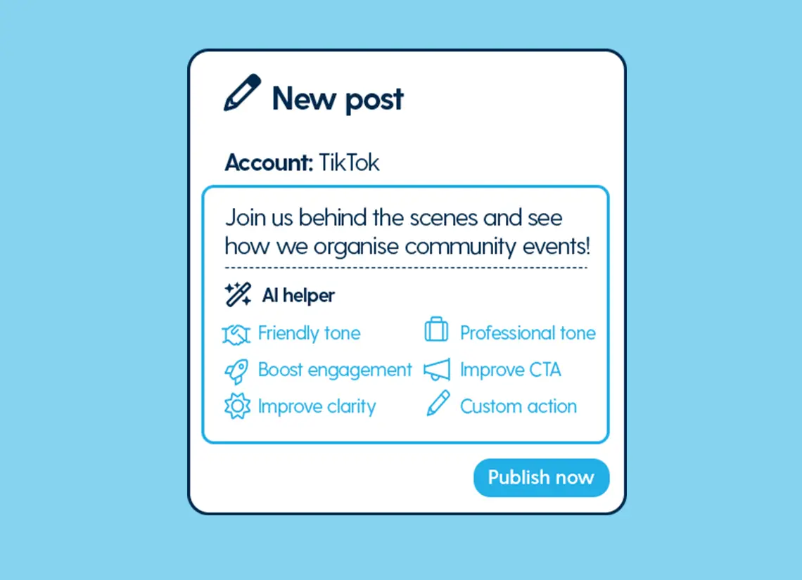 The AI helper is integrated in the post creation flow. You can choose to change the tone of voice, improve clarity or create your own prompt.