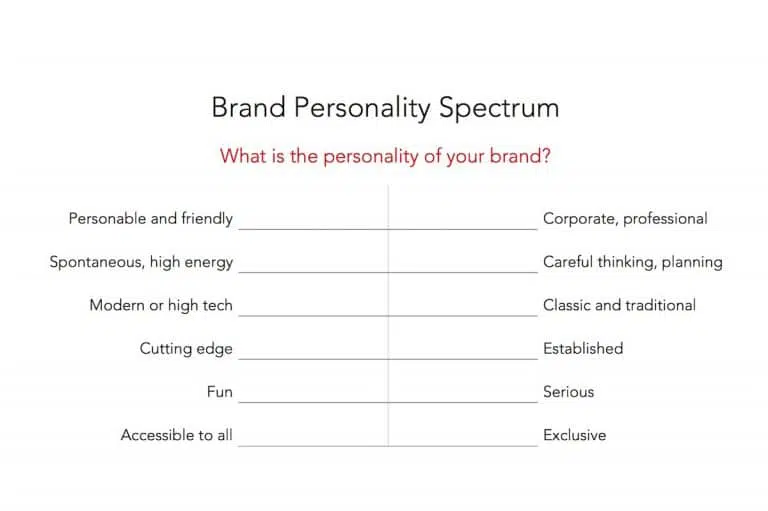 Het Brand Personality Spectrum kan je helpen om het marketingkarakter van jouw merk vast te stellen. Per stelling zet je een kruisje op de horizontale lijn waar jij denkt dat jouw merk ongeveer zit. Het is niet nodig om hier lang over na te denken, laat je leiden door jouw eerste ingeving. Zitten de kruisjes voornamelijk aan de linkerkant van het spectrum? Dan is je merk modern, dynamisch en innovatief. Zitten ze meer rechts? Dan is je merk meer conservatief, traditioneel of exclusief. Neem dit mee bij het bepalen van jouw tone of voice.